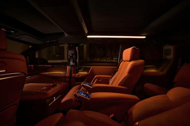 据悉,舱内实际使用长度超3.6米,三排座椅均采用全粒面Nappa高级真皮材质,搭配海岛超纤麂皮绒顶衬与15mm绒高超厚澳洲羊毛地毯,营造出媲美豪华住宅的内饰质感。