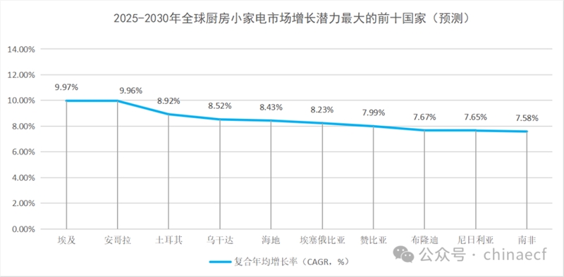 从国家来看,中国、印度、美国是全球仅有的厨房小家电市场规模在百亿美元及以上的国家。数据显示,2024年,中国、印度、美国的厨房小家电市场规模分别为308.48亿美元、156.41亿美元、98.55亿美元,预计到2030年将分别增至392.13亿美元、210.55亿美元、118.76亿美元,从2025年至2030年的复合年均增长率分别为4.03%、5.02%、3.14%。从增长潜力来看,从2025年到2030年,厨房小家电市场增长潜力最大的前十国家中,除土耳其和海地外都是非洲国家。其中,埃及增长潜力最大,未来几年的CAGR达到9.97%,而尼日利亚作为厨房小家电市场规模、增速双领先的国家也十分值得关注。